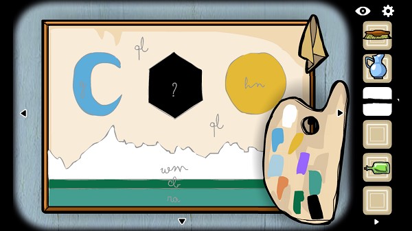 在房间里找到的颜色和对应字母提示是这样的:【浅蓝底+字母gl】【深绿色+字母d】【蓝底+字母g】【黄底+字母hn】【白底+字母wm】【绿底+字母na】。拿画笔蘸对应颜色去涂画(操作有点考验耐心,点颜料再在相应位置涂,等系统自动填满就行),把画面都填好后,灰色门的油画视角会变成下图那样。填完后,用黑色颜料涂中间的六边形,就能拿到【黑方块】。