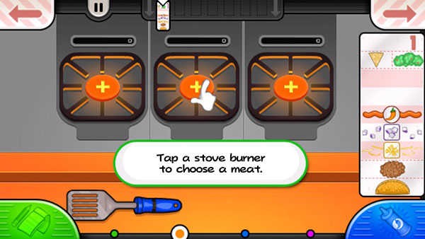 6、现在我们加热肉,在灶台上一个记时器,等时间到绿色的时候,拖动铲子来反动食材,等时间好了,拖动食材到饼里,然后点击蓝色按钮。