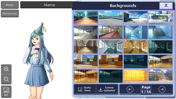 3、点击左下角的BG,你可以在这里给角色换背景,也能上传自己的图片当背景,超自由