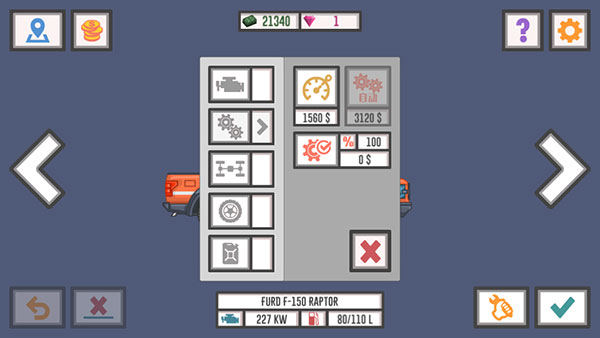 4、改装界面可以调整引擎、轮胎、油耗等项目,升级会花时间,急着用车的话可以用金币加速,省时省心。改装后的变化很明显,开起来差别能感觉到。