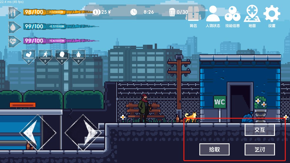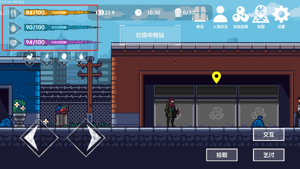 (1)拾取:用来跟废品和垃圾桶互动,能捡到一些能换钱或者吃的东西。