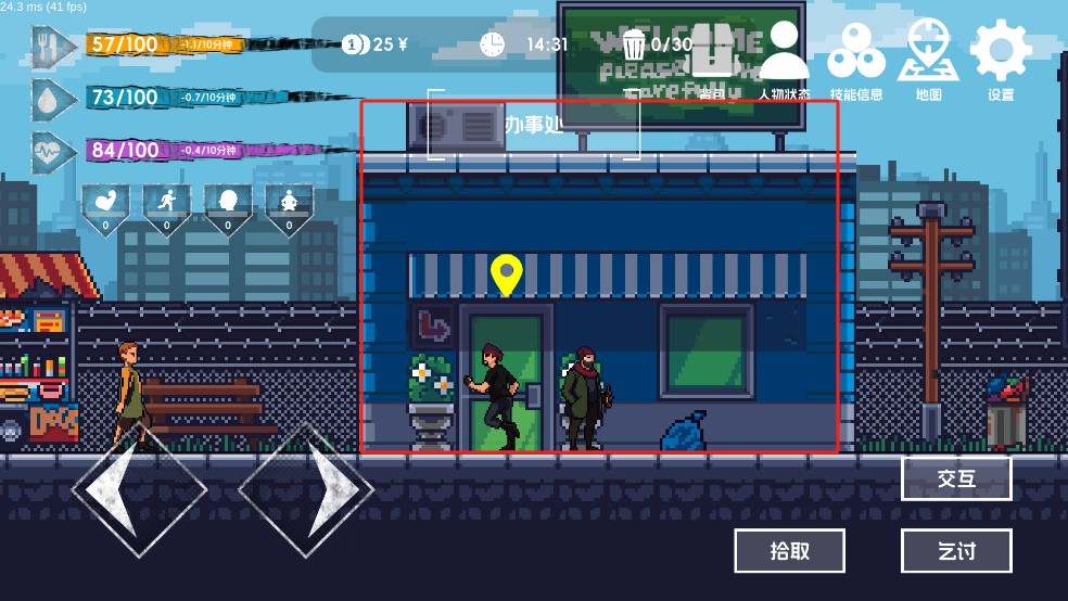 3、采用像素画面,带来独特的视觉体验。你要扮演一个身无分文的乞丐,在城市里摸爬滚打,体验一种别样的人生轨迹。