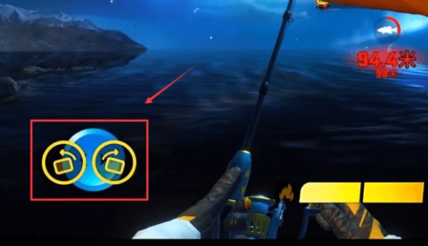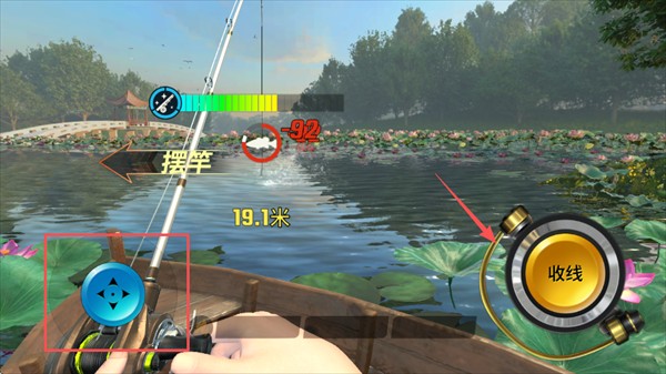 4、长按收线按钮会消耗鱼的体力,这家伙有劲的时候挺费力的,当屏幕出现提示时,像这样摆竿应对就好,跟真人对拉一样有感觉。