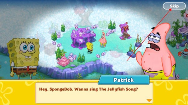2、进到剧情里会看到,海底几乎被果酱覆盖,乱糟糟的。如果你不想看剧情,可以点右上角跳过,省时间直接开干。