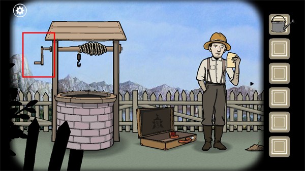 5、从右边拿起花洒,走到水井边,把花洒放进井里,点左边的滚动阀把花洒放下去接水,再点一下阀门把装满水的花洒拿上来;