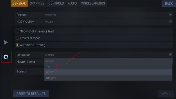 2、接着点左侧齿轮按钮,找到【Language】,选择语言为【中文】;