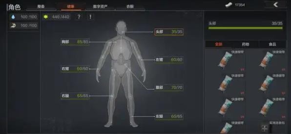 损伤会影响身体机能。头和胸一旦损伤就很危险,会直接导致撤离失败,所以要赶紧处理。手臂受损会拖慢开镜和稳定性,搜东西也慢;腿被打坏会跑不快,甚至不能冲刺;腹部受伤会让你趴不下,还会加速水分和能量的流失。