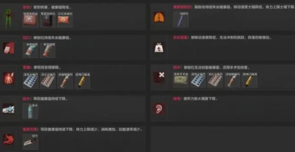 新手常碰到的三种状态是:受伤、创口和损伤。对应的医疗物品分别是医疗包、绷带和手术包。常见做法是找个安全角落先用绷带止住持续掉血,再用手术包修复损伤,最后补个医疗包把血加满。