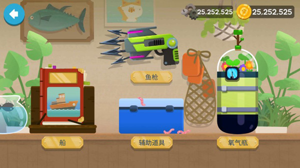 出海的时候会用到渔船、捕鱼鱼枪和氧气瓶。氧气瓶的容量决定了你在海底能待多久,容量越大,能逗留的时间也会越长;鱼枪是主要的捕鱼工具,游戏里的鱼枪种类很多,每把大致会有这些属性:穿透力、连射频率、射击速度、射程覆盖和氧气消耗,当然这些都可以通过升级来强化;船是带你去不同海域的交通工具,高等级的船能开得更远,能探索更深、更神秘的海域。