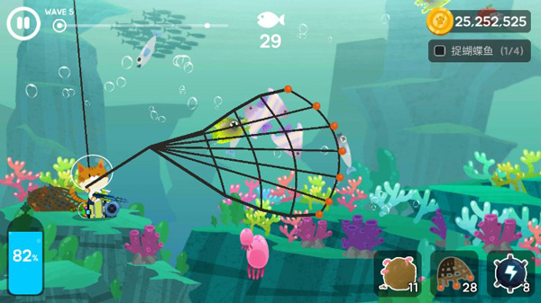 选好目的地之后就能下手开干了。游戏里还有些辅助道具会在关键时候派上用场,比如吸引鱼群的鱼饵、一次性收集大量鱼的渔网,还有能短时间麻痹敌人的电弹,合理搭配这些东西能大幅提升战果。