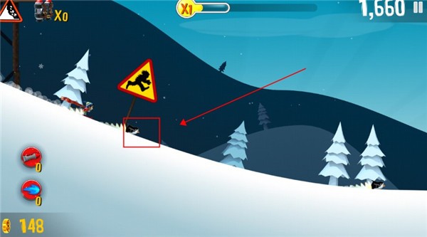 滑雪难免会摔,别看高手也会倒地。摔了就猛点屏幕,角色会快快爬起来,别让人家趴那儿干瞪眼。