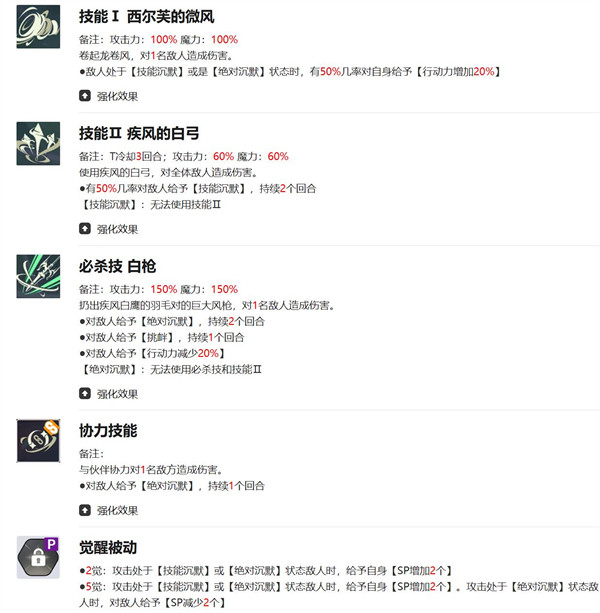 技能方面,风刃是个起手招,击倒或暴击会触发全体追击,和多段输出的队友配合会很顺手。疾风之白弓有宝贵的群体破甲效果,60%的触发率在实战里感觉够稳定。必杀白枪则是控场的大招型,150%单体伤害带上绝对沉默加上挑衅的双重debuff,能把对面关键输出或辅助给卡住,主动技和大招都被压制住的话,对方套路容易被打断。醒被动让控制更有延续,打到被沉默的目标会回复SP,方便接后续连招;满5觉醒后还会追加SP削减,这个效果能把对面拉进一个放不出技能、掉SP、继续放不出技能的恶性循环。这一套技能设定让尤诺既能当副C补刀,也能当战术型控场主C,灵活度高。